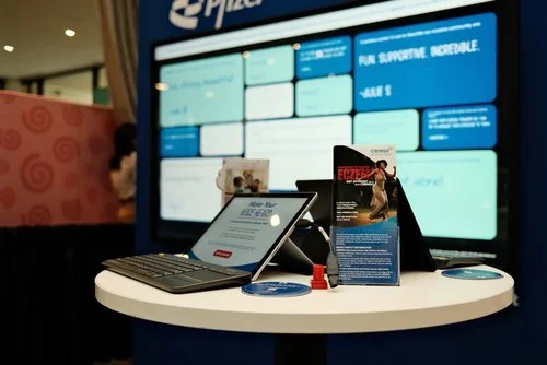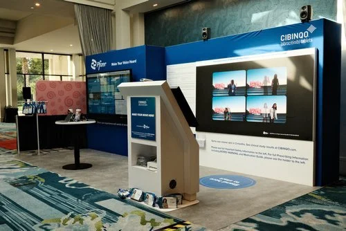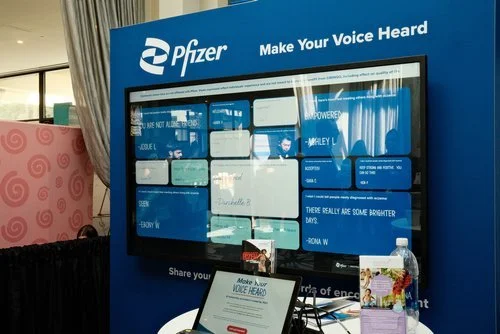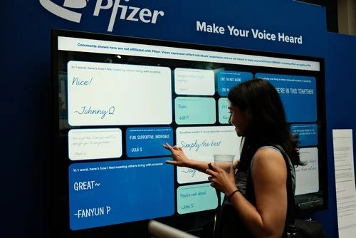 Using a tablet, attendees were invited to answer prompts about their experience with eczema, lend support, and share words of advice and encouragement with the eczema community. Their answers were shared to a giant interactive LED screen in the booth, creating an evolving board full of their own words. With light branding to fit the CIBINQO Make Your Move campaign, the feature offered a space for people with eczema to connect and learn more about Pfizer's eczema treatment options.