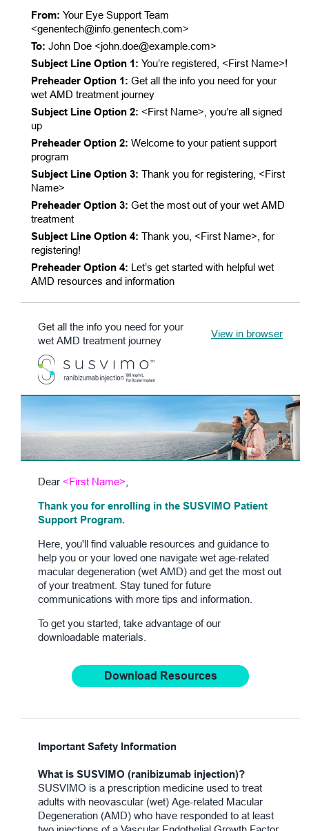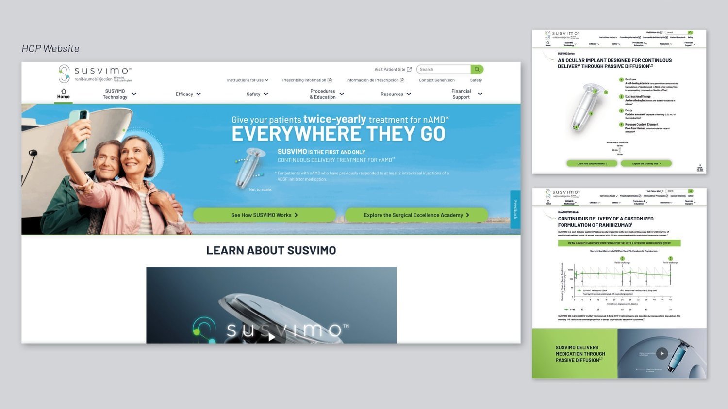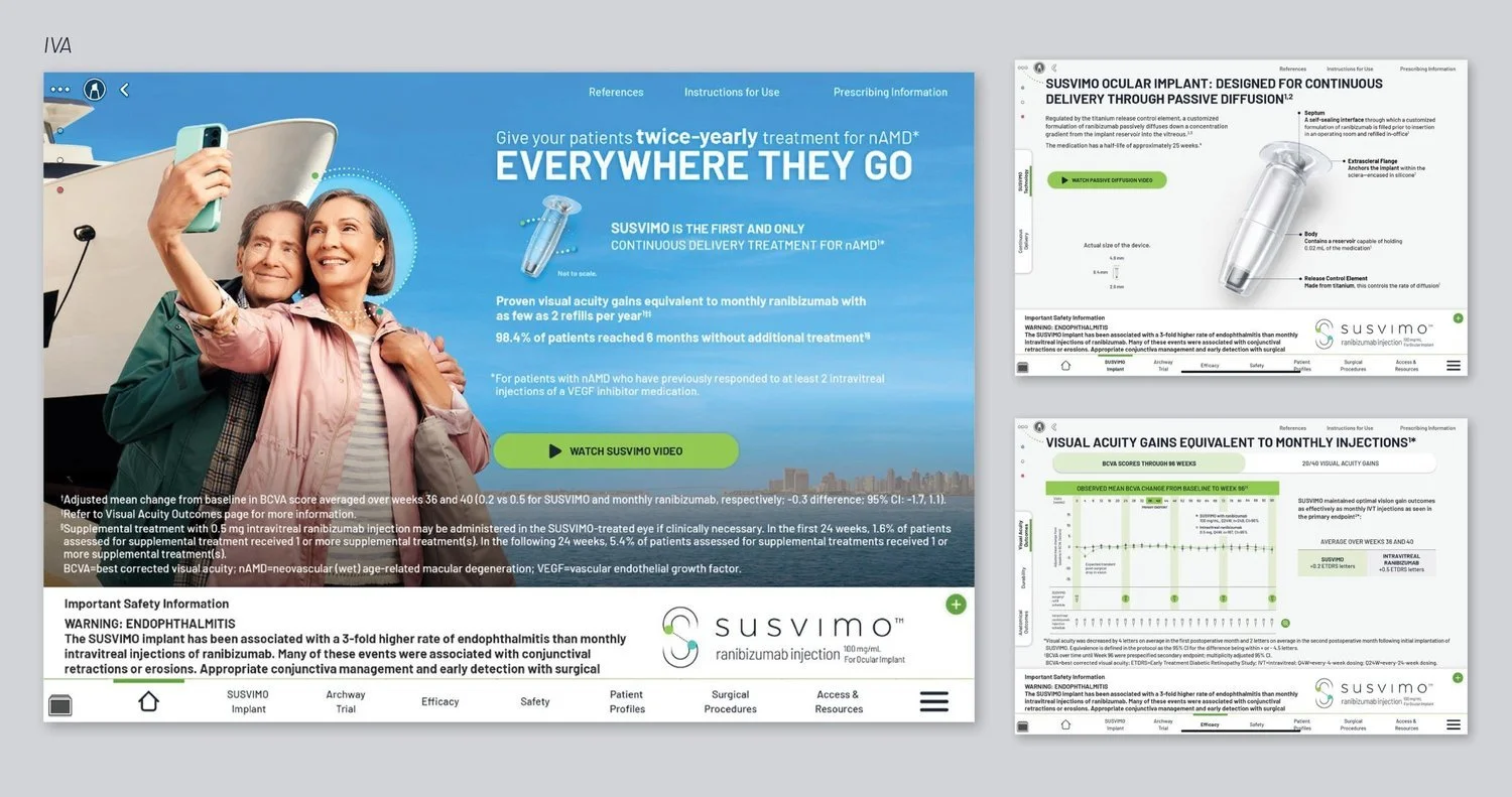 For our retina specialists and ophthalmologists, we put greater focus on the innovative technology that makes SUSVIMO a first-in-class treatment. In our iVA and HCP website, clinical leave behind, campaign launch emails, banner ads, and Twitter posts, we distinguished SUSVIMO as a durable, long-acting treatment with proven clinical results for patients, Everywhere They Go.