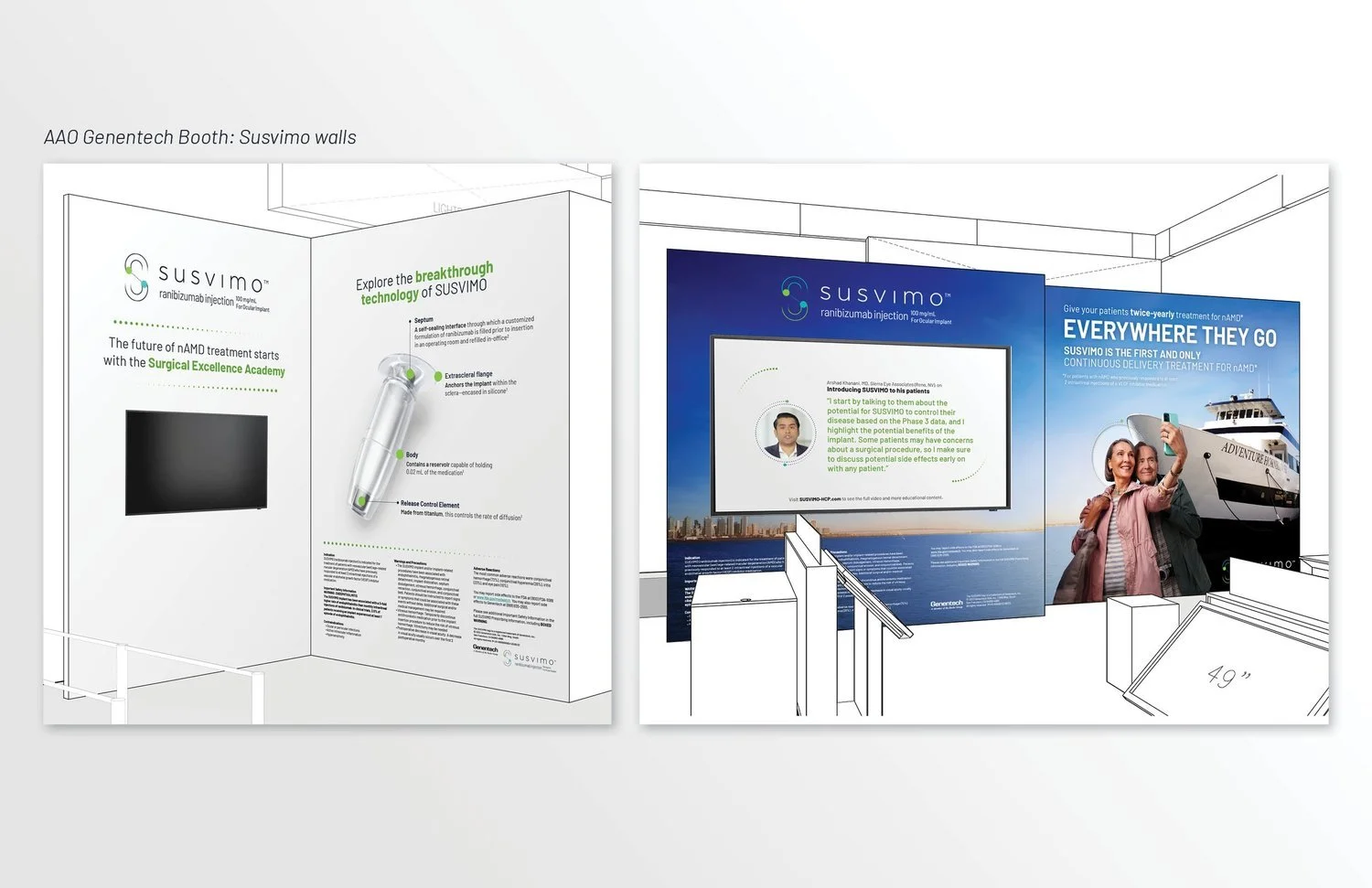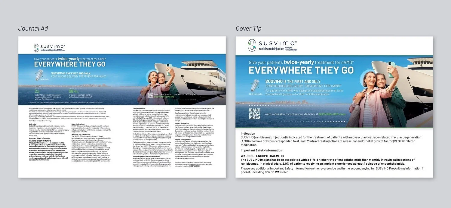SUSVIMO is first-of-its-kind ocular implant that continuously delivers medication to treat wet age-related macular degeneration (AMD). Through its unique dosing system, SUSVIMO gives patients the option to go from monthly eye injections to as few as 2 per year. SUSVIMO launched in October 2021 and effectively relaunched in October 2022 with the Everywhere You Go (DTC) and Everywhere They Go (HCP) campaign to highlight its innovative delivery method and freedom from monthly injections.